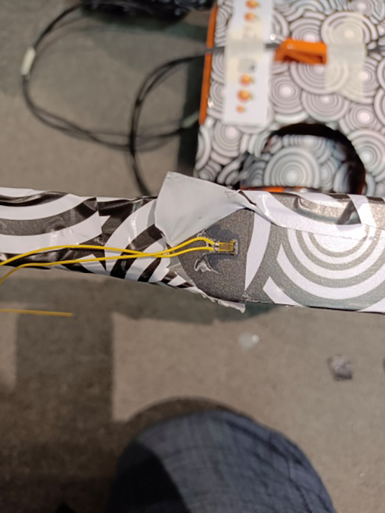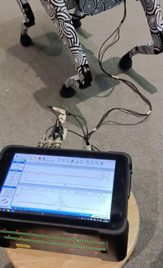 把加速度传感器安装在机器狗的身体中部,应变片贴在腿部,测试机器狗在不同工作状态下自身的振动情况和形变变化。