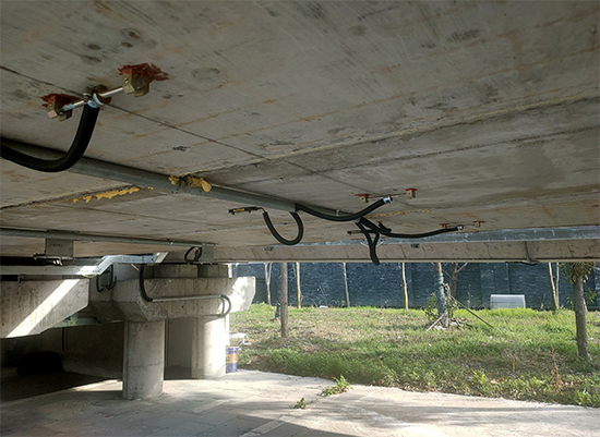 在桥梁选点布置传感器,连接数据采集仪,试验开始通过传感器测出测点产生的振动频率,根据数据分析、计算,得出结果。