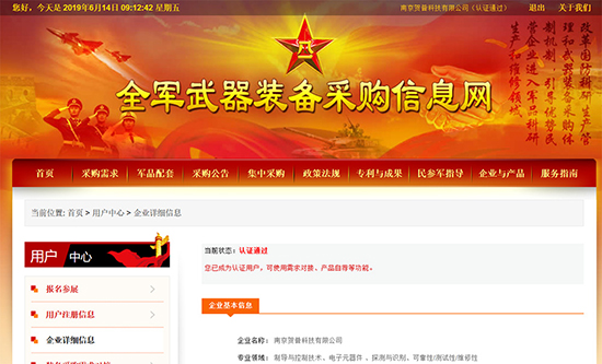 2019年5月28日,我司在全军武器装备采购网认证成功,公司发展再上新台阶。