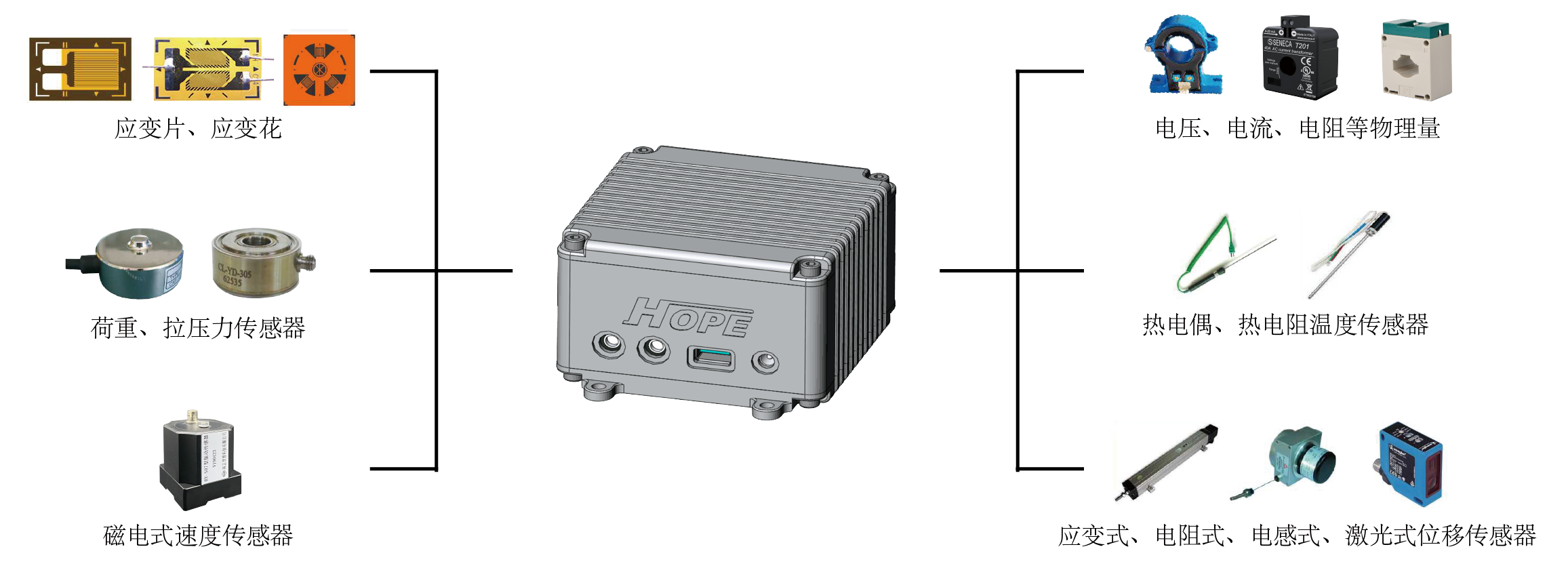 应变:全桥、半桥、1/4桥二线制、1/4桥三线制、1/4补偿桥。