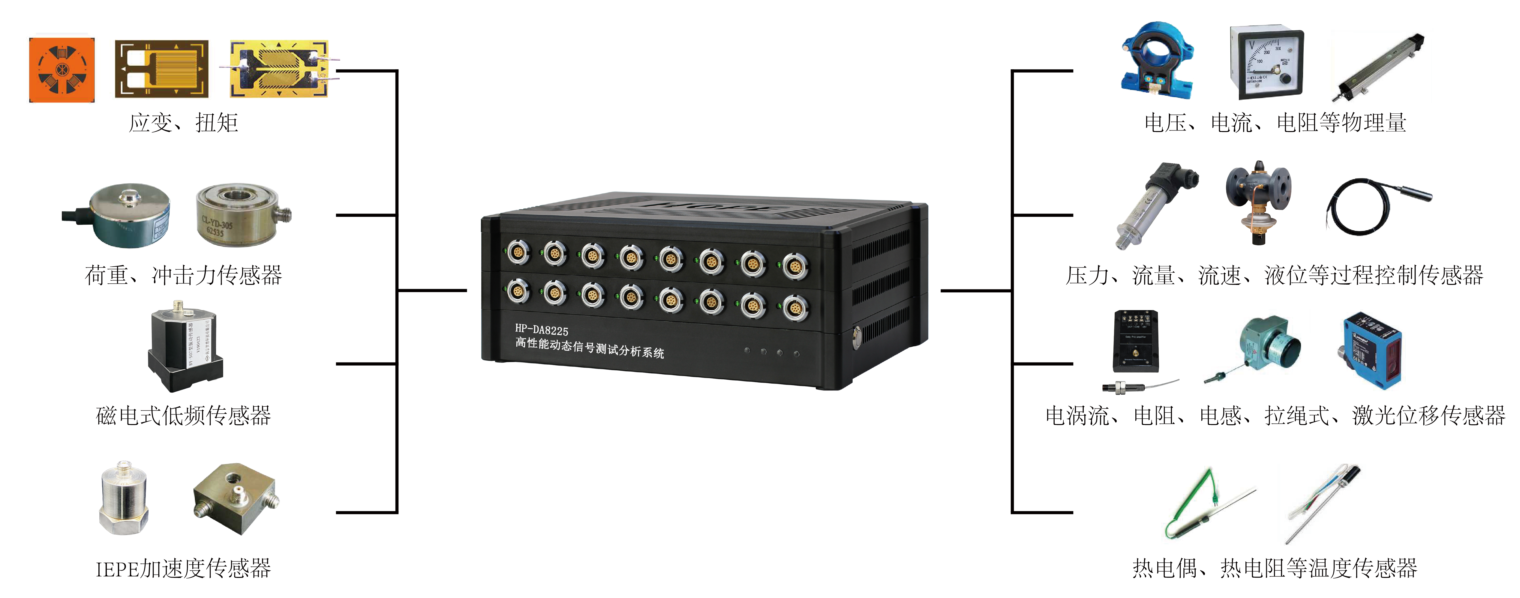 3、测试类型:(电桥、电压、电流、电阻、温度、振动、位移、电荷等,无需外置调理)