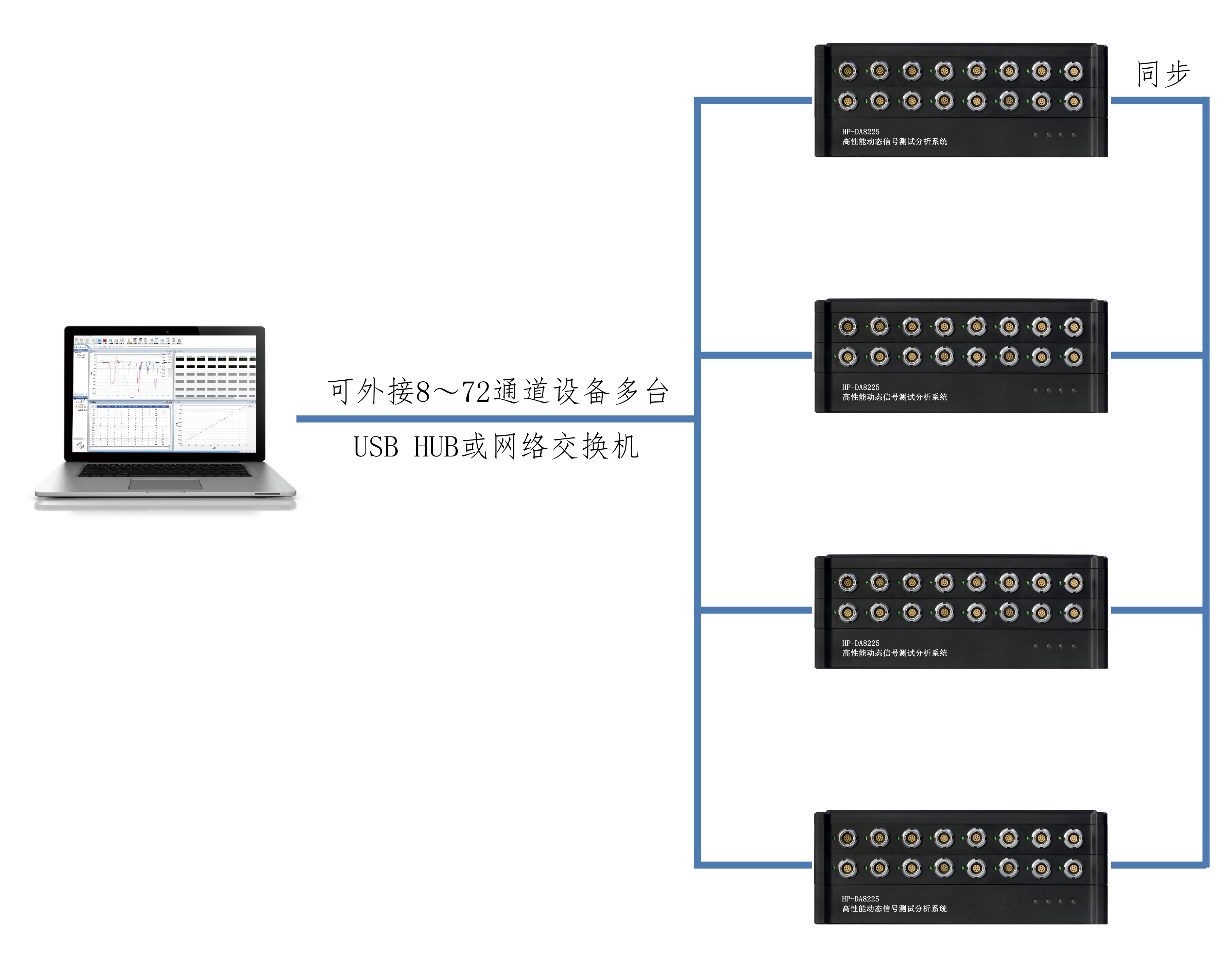 1、测量点数:单台8~72通道可选,可多台组网形成千通道级测试系统。