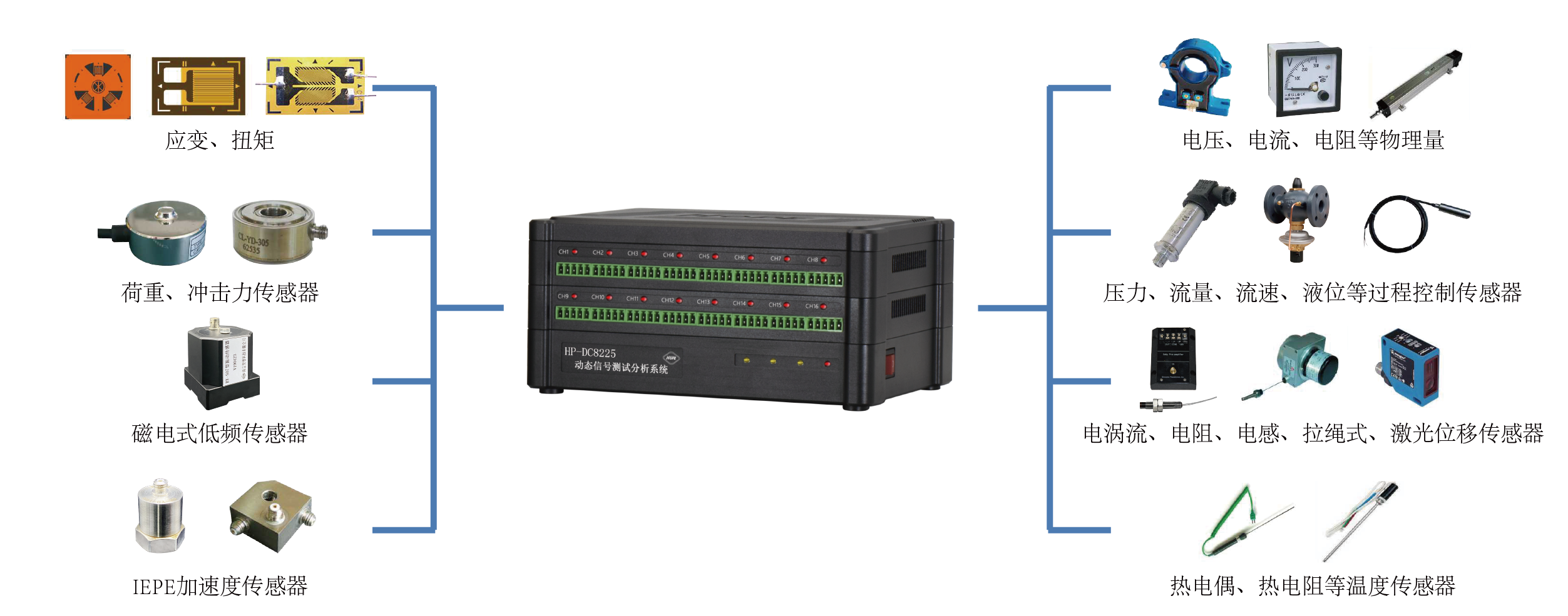 3、测量类型:每通道任意选择输入类型,混合接入不同传感器,无需外接调理模块。
