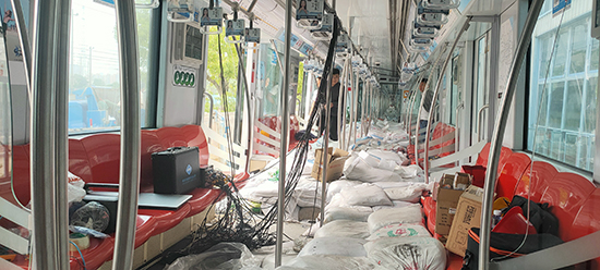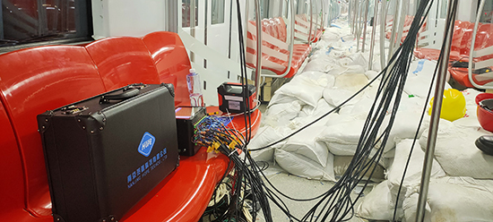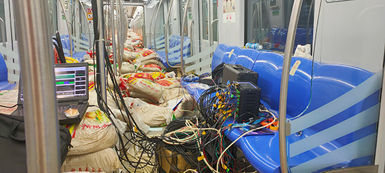 在地铁车厢内部及外部测点上安装传感器,连接数据采集仪,试验开始通过传感器测出测点产生的应变、加速度数据,根据数据分析、计算,得出结果。